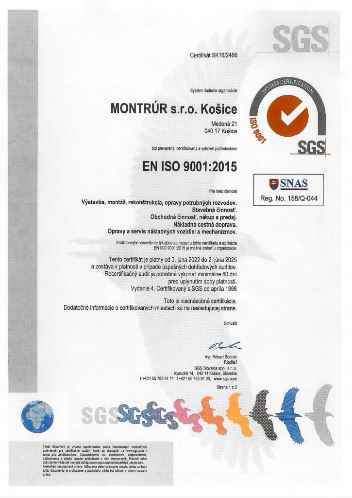 Certifikát vydaný SGS Slovakia spol. s r.o. podľa STN EN ISO 9001 v systéme riadenia kvality na činnosť: Výstavba, montáž, rekonštrukcia, opravy potrubných rozvodov. Stavebná činnosť. Obchodná činnosť, nákup a predaj. Nákladná cestná doprava. Opravy a servis nákladných vozidiel a mechanizmov.